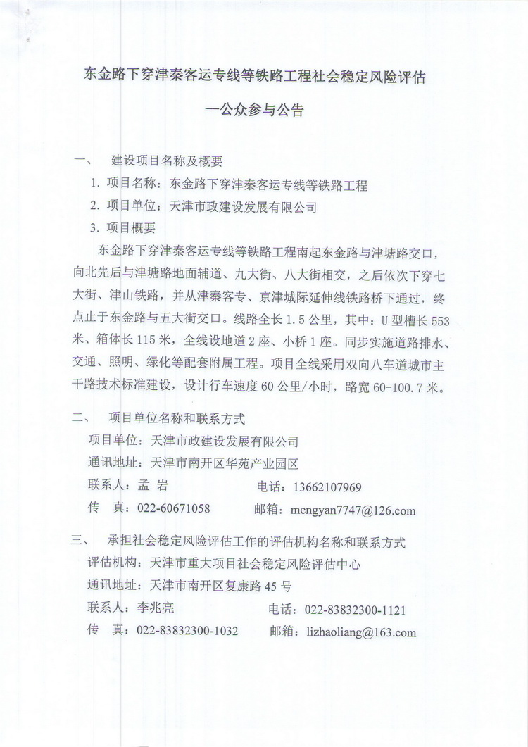 公眾參與公告:東金路下穿津秦客運專線等鐵路工程社會穩定風險評估