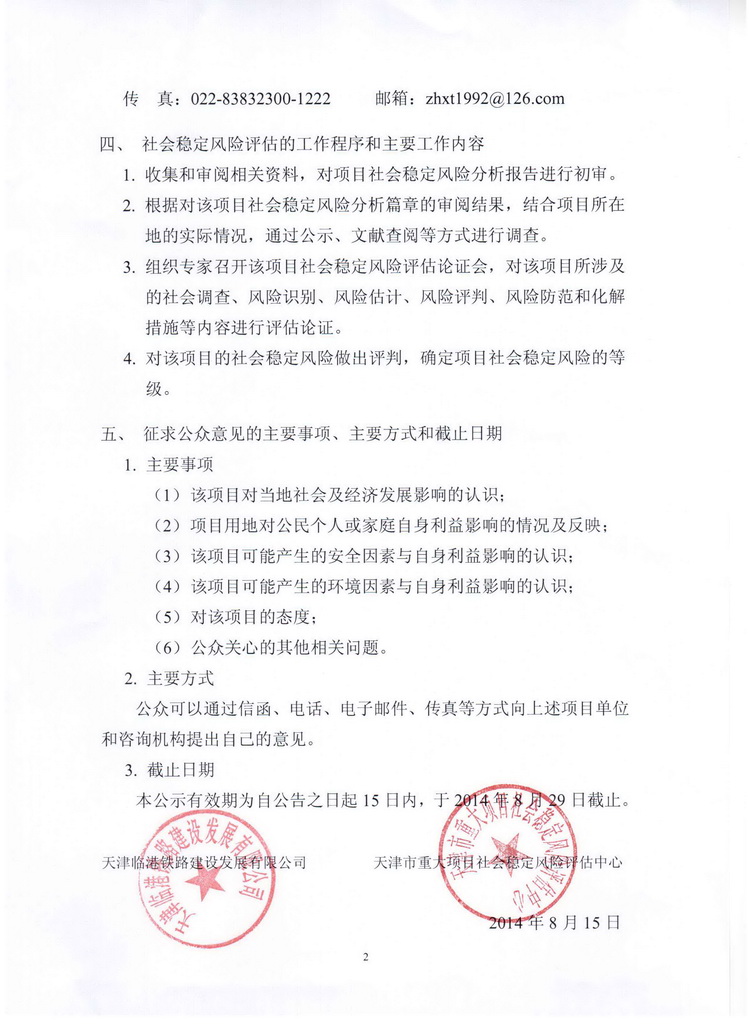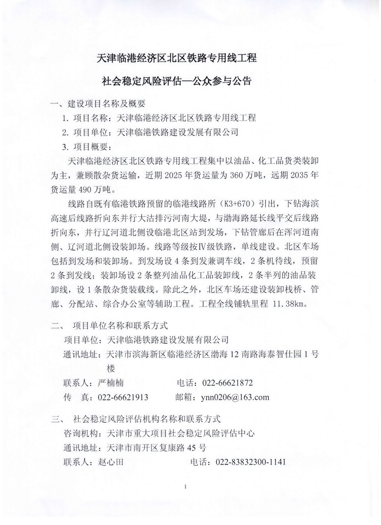 公眾參與公告:天津臨港經濟區北區鐵路專用線工程社會穩定風險評估
