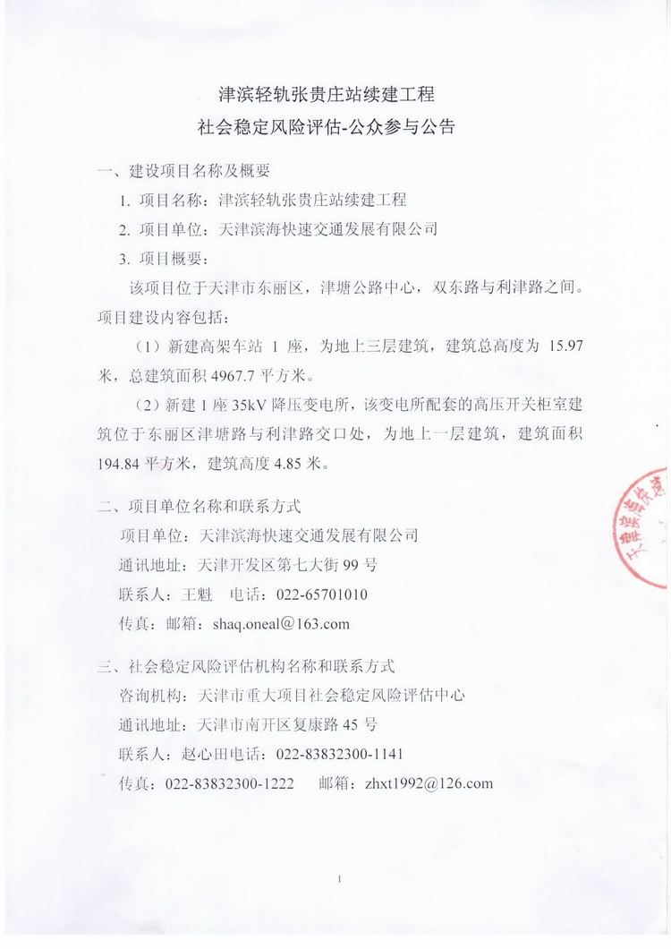 公眾參與公告:津濱輕軌張貴莊站續建工程社會穩定風險評估