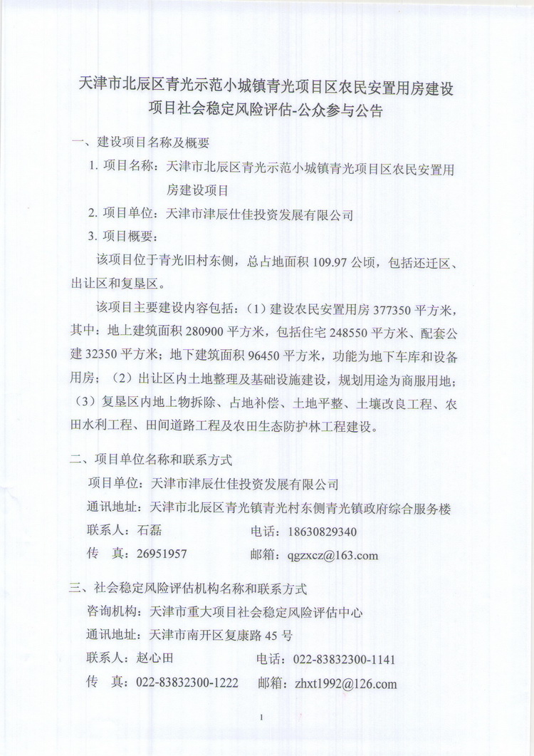 公眾參與公告:天津市北辰區(qū)青光示范小城鎮(zhèn)青光項(xiàng)目區(qū)農(nóng)民安置用房項(xiàng)目社穩(wěn)評(píng)估