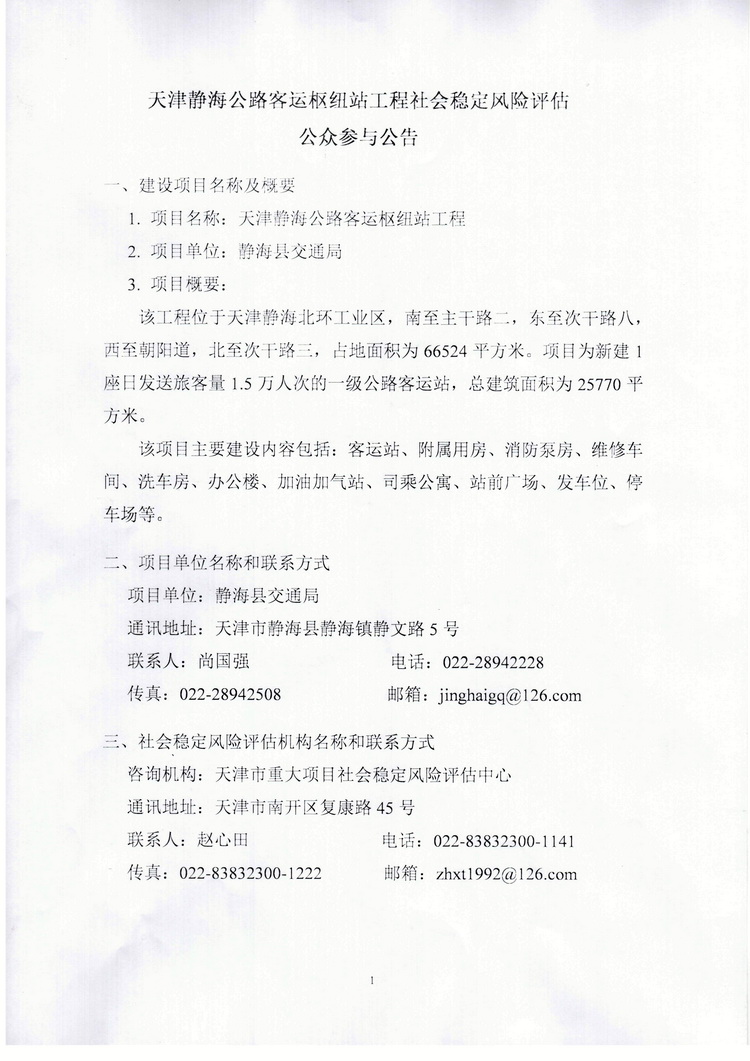 公眾參與公告:天津靜海公路客運樞紐站工程社會穩定風險評估