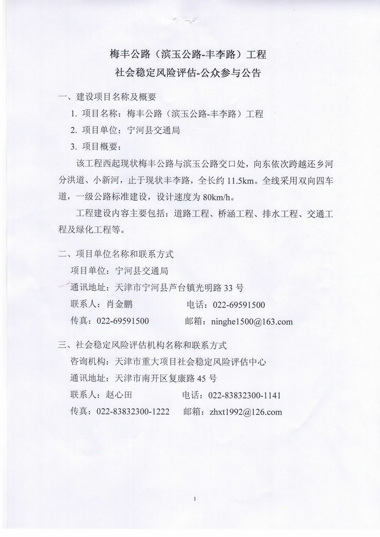 公眾參與公告:梨雙路(津淄公路-津港公路)改擴建工程社會穩定風險分析