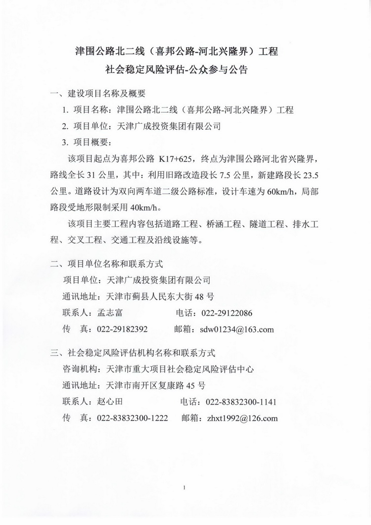 公眾參與公告:津圍公路北二線(喜邦公路-河北興隆界)工程社會穩定風險評估