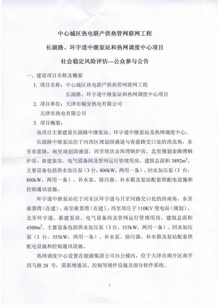 公眾參與公告:中心城區熱電聯產供熱管網聯網工程長湖路、環宇道中繼泵站和熱網調度中心社穩評估