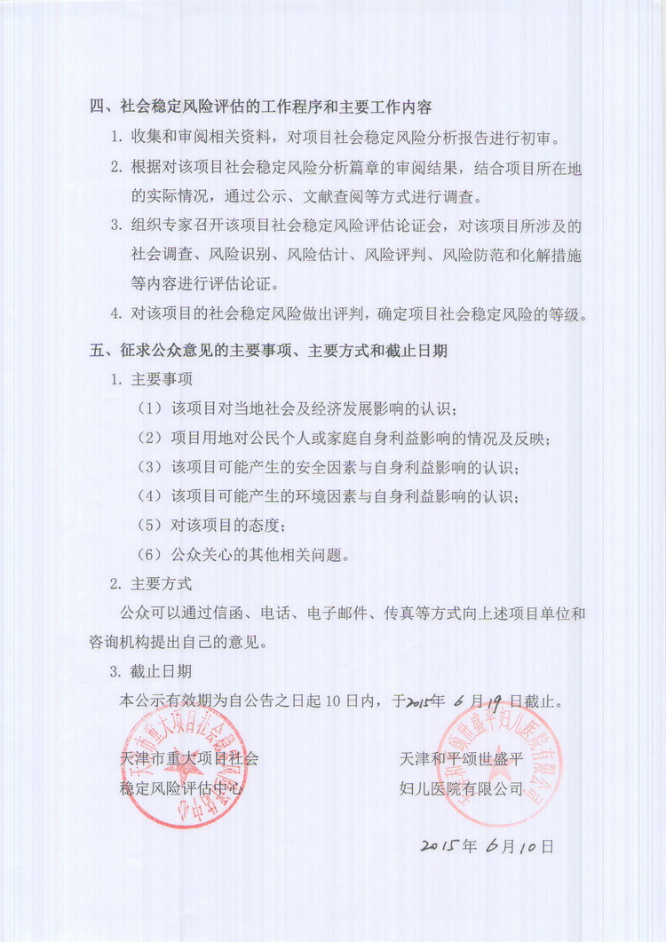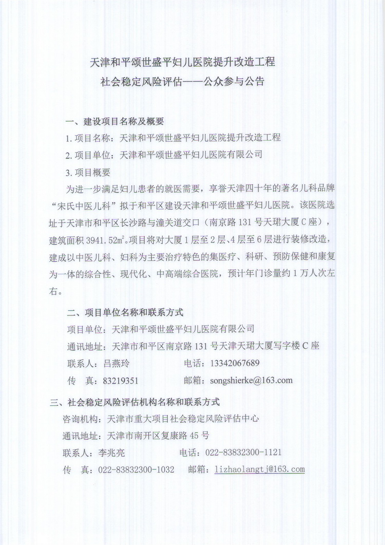 公眾參與公告:天津和平頌世盛平婦兒醫院提升改造工程社會穩定風險評估