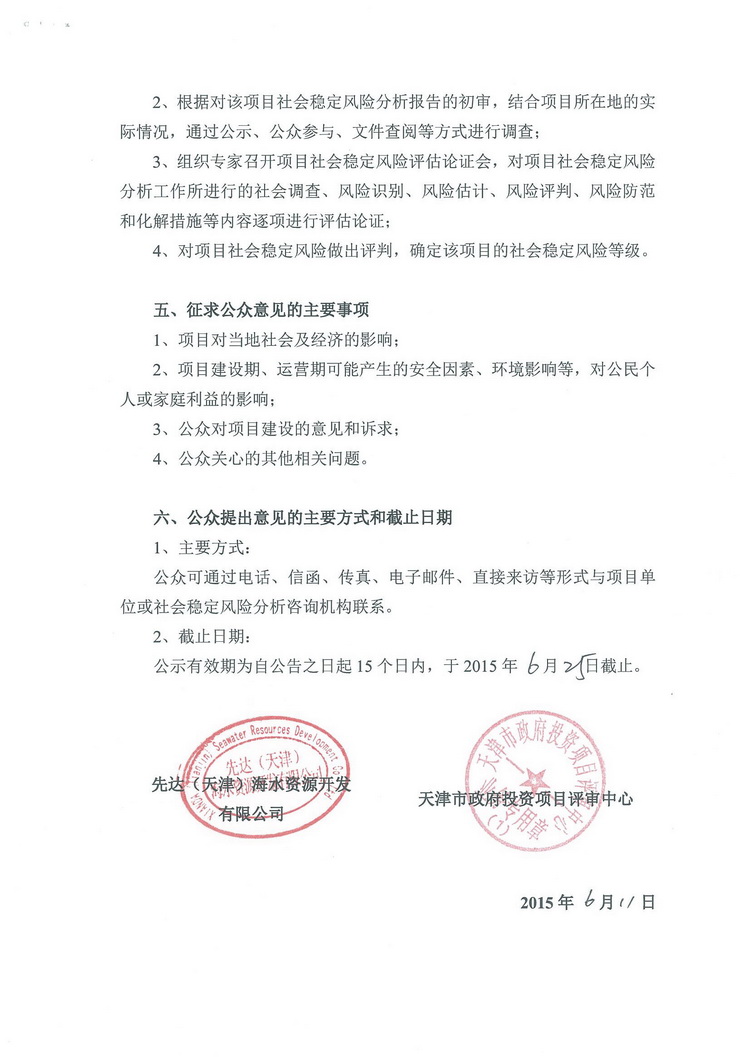 公眾參與公告:先達(dá)公司天津南港工業(yè)區(qū)海水淡化及綜合利用一體化項(xiàng)目配套能源社穩(wěn)評(píng)估