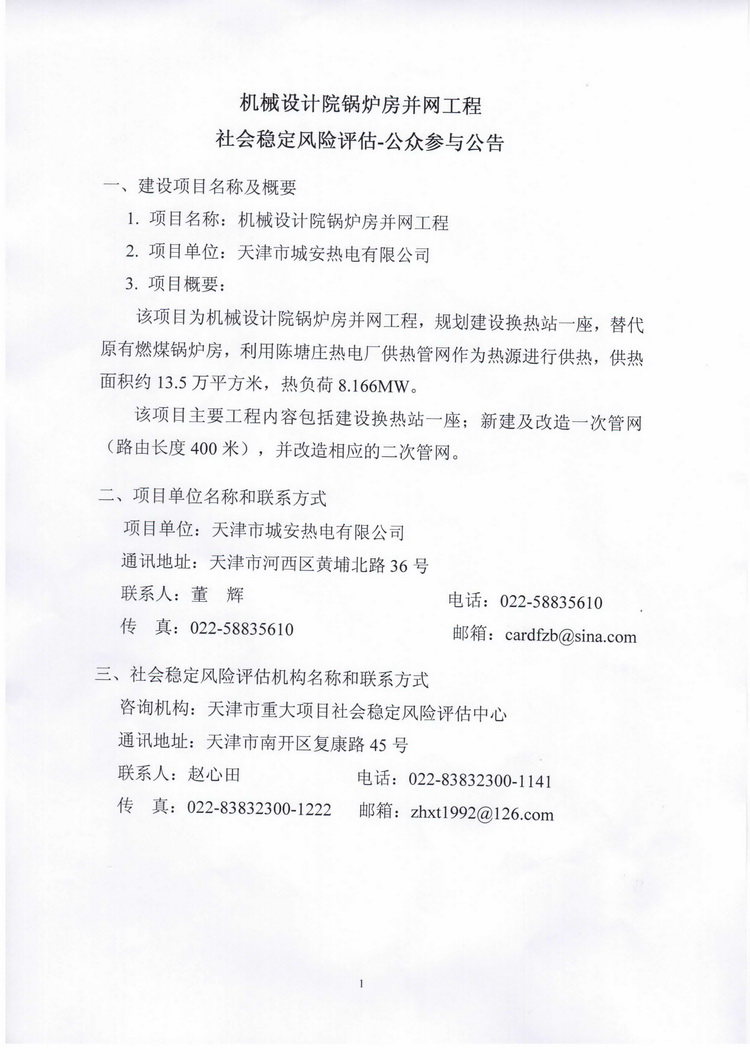 公眾參與公告:機械設計院鍋爐房并網工程社會穩定風險評估